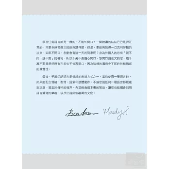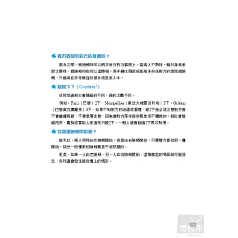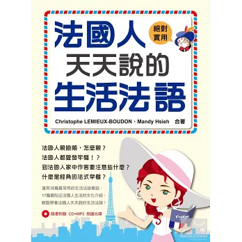 而現在,您就可以一邊學習最常用的生活法語,一邊了解法國人的生活文化。您可以透過《法國人天天說的生活法語》8大類、38種情境,運用「社交」、「一天的生活」、「咖啡廳/茶館」、「餐廳」、「購物」、「休閒生活」、「困擾」、「情感表達」等單元,從最貼近法國人生活的主題出發,馬上學會法國人天天在用的會話,並融入法式生活。