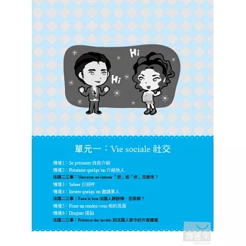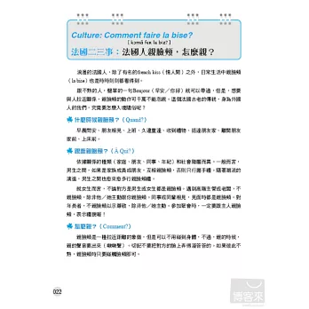 全書17篇最貼近法國人生活的文化介紹,從稱呼「您」或「你」開始,到法國人親臉頰的方式、到法國人家中作客的禮儀、經典法式早餐、法國名牌的小常識、法國各地的名產……,讓您彷彿置身於法國人浪漫生活中。