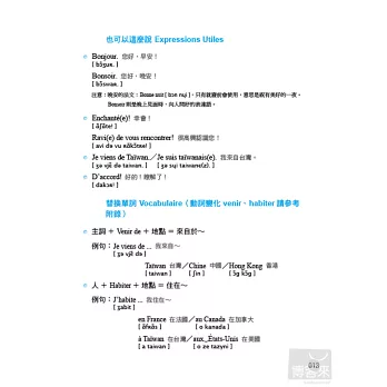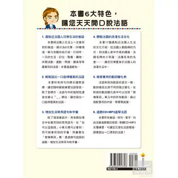 本書配合生活會話,還有17篇最貼近法國人的生活文化介紹,帶您認識最迷人的法式文化。從稱呼「您」或「你」開始,到法國人親臉頰的方式、到法國人家中作客的禮儀、經典法式早餐、法國名牌的小常識、法國各地的名產……,讓您學到法語也學到最道地的法國人浪漫生活。