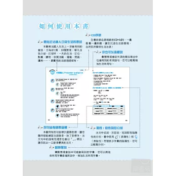 全書除了情境會話外,其他類似場合中也會用到的常用語句,您在「也可以這麼說」小單元裡可以看到;而同樣情境中可能會用到的字彙,則為您彙整在「替換單詞」裡。您可以將這些常用語句和字彙套進對話中,透過換句話說的遊戲,增加生活常用句和字彙。