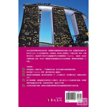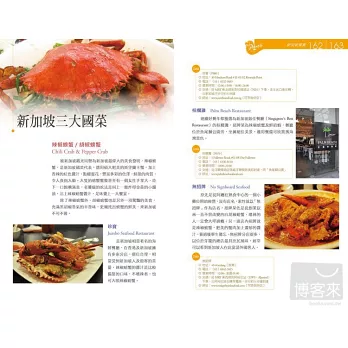 •除了辣椒螃蟹、海南雞飯及肉骨茶等三大國菜外,還介紹內行人才知的巷內美食。詳細整理新加坡當紅的伴手禮,在超市就可搞定,省錢又不失禮。
