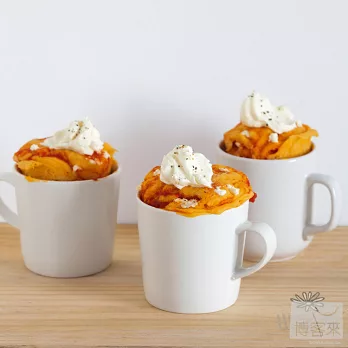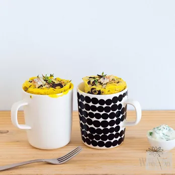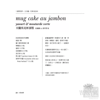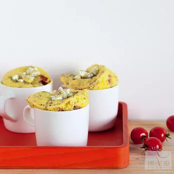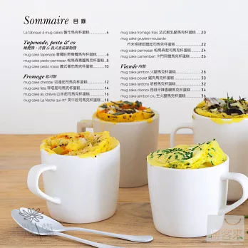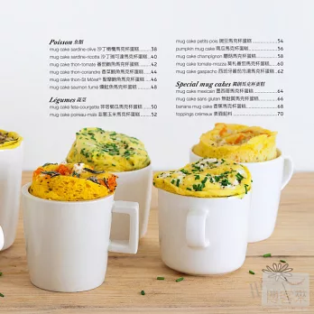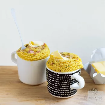 在歐美日本引發大流行的馬克杯鹹蛋糕Mug Cakes,介於鹹馬芬(muffin sale)和鹹蛋糕(cake sale)之間。可用湯匙、切片或直接用手享用,甚至是塗上奶油或法式鮮奶油…等方式品嚐,趁熱或放涼都非常美味。和甜味的馬克杯蛋糕一樣,是一種大家都能做,有趣、而且非常快速就可以變出來的蛋糕。只要有1只馬克杯,加上廚房現有的材料,想吃!5分鐘之內就可以熱騰騰地馬上享用!