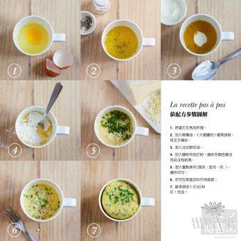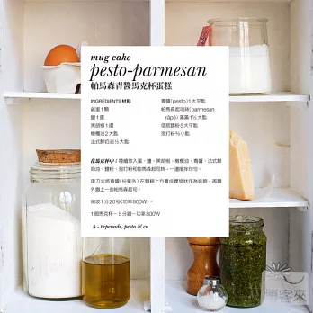 所有的材料都以湯匙計算,大匙(湯匙)和小匙(咖啡匙)更方便準備,完全不需秤量。依序加入馬克杯後攪拌一下放入微波,1分40秒完成!不論是匆忙中營養均衡的早餐;工作時補充體力腦力的快速點心;壞天氣懶得出門也可以一飽口福的餐點…,馬克杯鹹蛋糕的口味還能夠自己搭配變化!