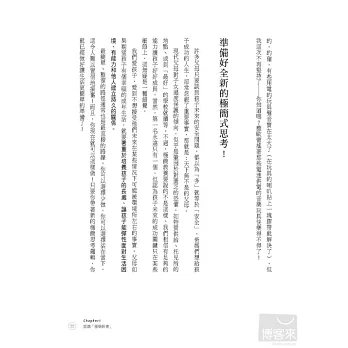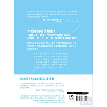 本書收錄上百個可馬上使用的小技巧,只要搭配書中的自我分析量表,靈活運用簡化思考,你家再也不會堆滿舊衣服和孩子的玩具,取而代之的是讓你心情愉悅的美好收藏;你不必每天準備一桌滿漢全席,仍可和家人共享營養美味的餐點;你不須慌亂地在照顧孩子的空檔中抽出時間整理家務,因為你已經能善用時間,在工作、家務、育兒中找到平衡。