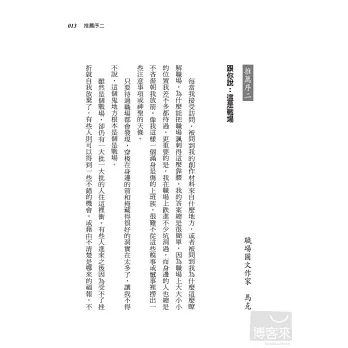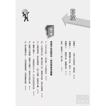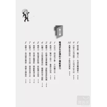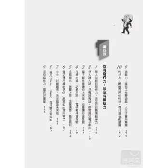透過作者的叮嚀,掃描你的競爭力缺口還剩多大一塊,建議你放哪些東西進去彌補,好避免你在職場上跌進烏漆抹黑、伸手不見五指的坑洞裡,或是協助你閃過一些明槍與暗箭。相信我,無論如何這都會是你需要的重要技能。─職場圖文作家 馬克