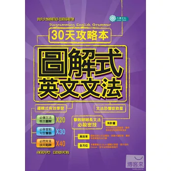 《圖解式英文文法》規劃了有效的系統性學習進度,只要一個月,讓你發現英文文法超easy,開口對話沒問題,還能輕易看穿常見的英文陷阱,為你打開悠遊在英文世界的康莊大道。《圖解式英文文法》讓學習變得更簡單、更容易持續。