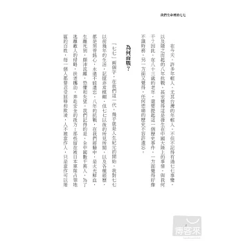 《我們生命裡的七七》,在「七七事變」的七十七週年前夕得以出版,張作錦先生花了最多心血。我們十分感謝他從策劃、邀稿到定稿的全程參與,以及原創性的貢獻。