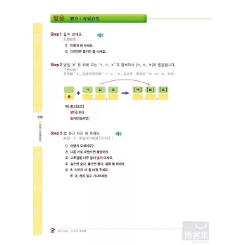 首爾大學教材的最大優點之一,即是每一堂課皆有「發音」單元,初學者不必囫圇吞棗地一次記完所有發音,可以循序漸進透過3個步驟練習每一課的發音主題。