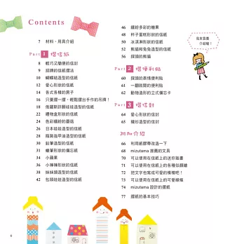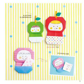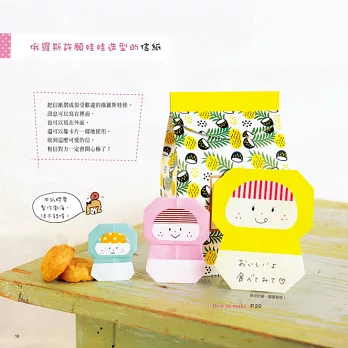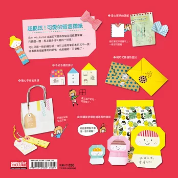 翻開書中你喜歡的造型,只要摺一摺,馬上變身成既可留言又可玩樂的可愛摺紙信!除了適用於生活中的便利摺紙,也有夾頁式的俏皮留言摺紙,另外也提供贈送禮物時最適用的貼心禮貌留言卡。