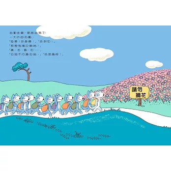 第一關,請勿摘花。遠足途中,看到美麗的花朵,心曠神怡,貓咪的眼睛抵檔不了美麗的誘惑,每隻貓都想摘花,就只摘一朵沒人會知道的。雖然虎斑貓老大試圖勸阻,仍阻止不了同儕團體的力量,貓老大最後也摘了、栽了。