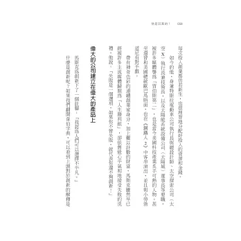 或許我們無法百分之百複製鋼鐵人,但是從他逐步成功的路程中,我們將發現:所有的偉大,都是從最早的微不足道開始。你還在等著接班、等著別人給機會嗎?向新品種的企業家學習,堅持創新、不與傳統妥協,你也可以像鋼鐵人一樣成就自我。
