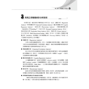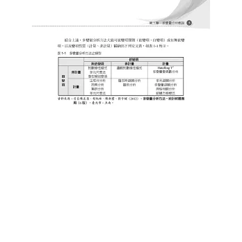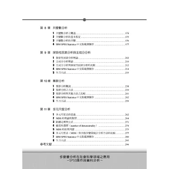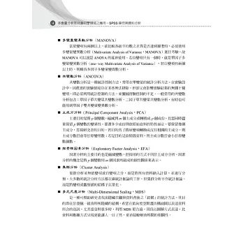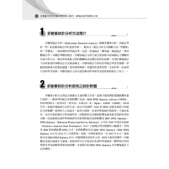本書提供兩大內容,一為各類多變量分析理論之介紹,另一則為搭配各理論之IBM SPSS Statistics 統計套裝軟體的詳細操作說明。