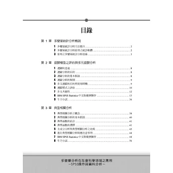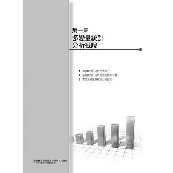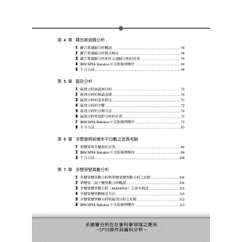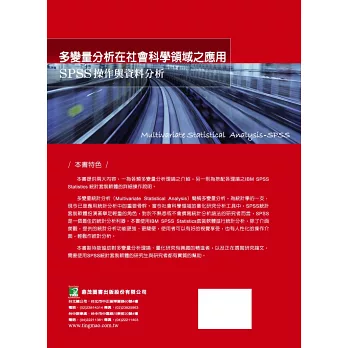 多變量統計分析(Multivariate Statistical Analysis)簡稱多變量分析,為統計學的一支,現今已是應用統計分析中的重要骨幹。當今社會科學領域的量化研究分析工具中,SPSS統計套裝軟體扮演著舉足輕重的角色,對於不熟悉或不會撰寫統計分析語法的研究者而言,SPSS是一個最佳的統計分析利器。本書使用IBM SPSS Statistics套裝軟體進行統計分析,除了介面美觀,提供的統計分析功能更強、更簡便,使用者可以有好的視覺享受,也有人性化的操作介面,輕鬆作統計分析。