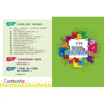 這本書針對關於小孩學舞的健康迷思,每一個爸媽的疑慮,請到專業物理治療師簡文仁細細解答,告訴你小孩學舞該注意些什麼?怎麼做才能避免運動傷害?並提倡小孩學舞其實有益身體的發展,促進感官統合,放手讓小孩舞動身體,反而可以找到自信,提升競爭力。