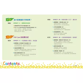 而由POP Corn三個小朋友學舞的故事,透過他們的實際經驗,讓你了解小孩如何藉著學舞這件事,探索身體找到自信,培養克服挫折的能力。POP Corn的爸媽就像每一個小孩的爸媽,對小孩學舞這件事,是否會耽誤課業?是否會影響生長?也曾經感到疑慮,而他們如何從反對轉而支持,其中的心路歷程這本書統統與你分享。