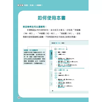 本書精選必考句型500句,並分成三大單元,分別是「初級篇(N4、N5)」、「中級篇(N2、N3)」、「高級篇(N1)」,還在每個句型旁直接標注級數,不同程度的考生可依自己的需求熟讀,不會再像無頭蒼蠅一樣不知道從何準備起,立即掌握應考關鍵。