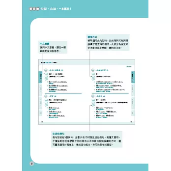 全書1500個生活化例句,不僅易懂又實用,可靈活運用於寫作上,增加造句及會話能力,亦可熟悉考試題型!