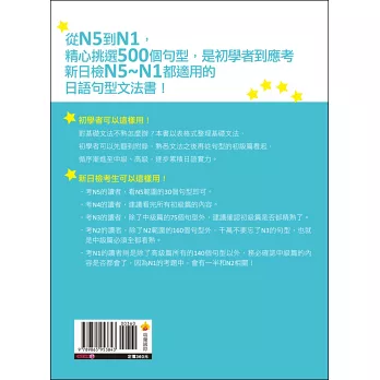 有了這本《新日檢句型‧文法,一本搞定!》,便能解決所有問題!因為這是一本從初學者到考新日檢N5~N1都適用的日語句型文法書!