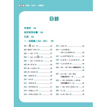 全書所有句型不僅區分出N5~N1新日檢考試級數,並依程度分為初‧中‧高級,就算不考新日檢,也可以依照自己的程度學習,學到哪裡,看到哪裡!此外,句型更依50音順序排列,方便隨時查詢!