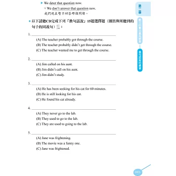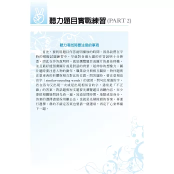 專業外籍人士錄音,搭配書中內容做聽力練習,協助讀者克服聽力上的恐懼感,一舉突破聽力障礙。