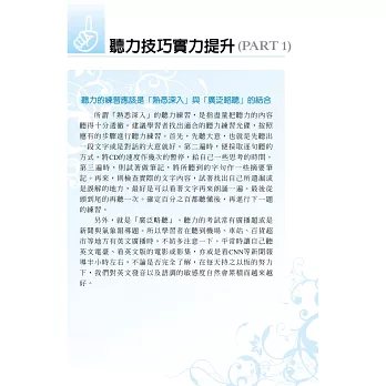 透過發音、連音、變音、省音、語調等介紹,抓出句子的關鍵詞彙,學習各種聽力技巧。