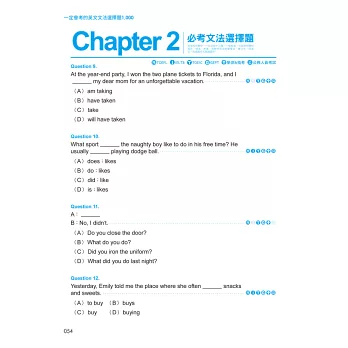 各類的英文考試的歷屆考題中,將完整的英文文法重點集結一起,讓學習者一目瞭然每一章節的學習主旨;從中不僅能學會如何解題,更能掌握於測驗中最常出現的單字、片語及句構用法,遇見文法不再頭痛。