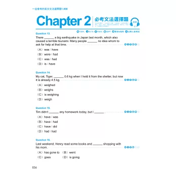 本書特別邀請專業外籍教師錄製完整的文法選擇題MP3,待學習者藉由閱讀吸收各類文法概念並內化後,即使邊走邊聽也能複習、掌握英文文法。一本書便能提升聽力及閱讀能力,學習雙效合一。