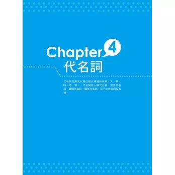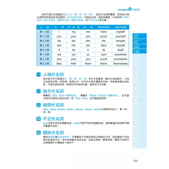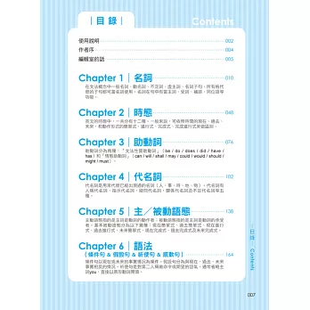本書完整收錄各類英文文法觀念,含括:名詞、時態、助動詞、代名詞、主/被動語態、語法、不定詞、動名詞、分詞 & 分詞構句、形容詞 & 副詞、比較級 & 最高級、關係代名詞、連接詞、主詞動詞一致、敘述句法、介系詞 & 慣用語、附加問句 & 附和句、倒裝句 & 疑問句、三大子句 & 特定句型……等十九個章節,學習內容最完善且豐富!