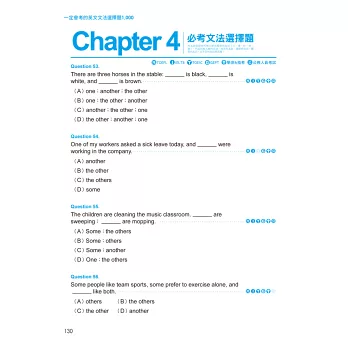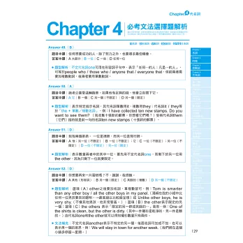 左頁試題、右頁解析的呈現方式,學習者能即刻掌握學習成效;作答完左頁的題目,馬上對照右頁的詳解,對於不懂之題目,能立即解惑,徹底吸收考題與其重點文法。