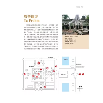 本書以三百多幅精采照片,完整呈現吳哥各寺廟的宏偉建築,並針對重點寺廟裡,精采雕像的神話傳說例如:乳海攪拌、羅摩衍那、摩訶婆羅多等神話故事;或是建築賞析與故事,包括不同時期的建築風格、門楣風格、特徵與代表寺廟,還有建築物本身象徵與改建等過程,乃至建築師等,一一詳析解說。此外,更以五十一張平面導覽圖,清楚標示寺廟必看景點及各經典長廊壁畫的相對位置,保證不迷路,菁華一次就看懂。