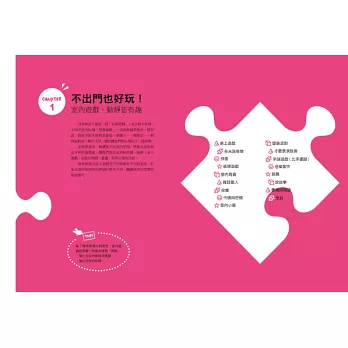 親子玩遊戲,道具和空間都不受限:壞天氣在室內玩動腦遊戲,天晴時去戶外自由舒展筋骨,就連沉悶的長途旅程,也有意想不到的互動遊戲可玩。只要發揮創意,帶著一顆童心來玩,其實很簡單!