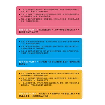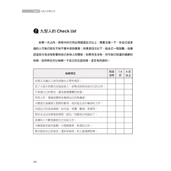 關於型態間的溝通祕密(本書第三章)非常實用,而我個人特別喜歡最後一章的「新生活」。這個章節提醒我們,人不等於性格模式,我們是有自主權的。只要持續練習,就能更加平衡每種型態。當中的Checklist就像是溫度計,提醒自己的性格健康狀態。我認為這是一本非常實用且完整的九型人格入門書籍。