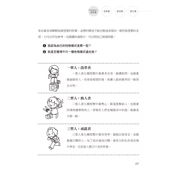 剛好有機會讀了《我的第一本圖解九型人格》這本書,藉此瞭解到九種不同的人格特質,也讓我更清楚自己的人生定位,因為書上針對每種人格,都詳細地介紹了其特色、發展與限制,我就能夠善用自己的優勢並且提早發現一直存在的盲點,避免犯下重複的錯誤。