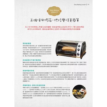 本書為《給新手的天然發酵麵包手記》作者最新暢銷烘焙書。作者以多年經驗親授家庭烘焙的各式技巧,為初次嘗試烘焙的新手們介紹使用小烤箱就能做的人氣烘焙食譜,收錄有麵包、餅乾、瑪芬、磅蛋糕、派等各式美味糕點。作者透過詳細的步驟圖,深入淺出說明烘焙基本技巧與正確使用烤箱的方法,對烘焙一竅不通的新守門只要轉轉小烤箱,即可輕鬆搖身烘焙達人。