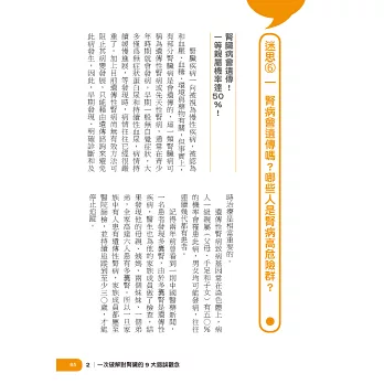 小心!以下都是害人喪命的錯誤迷思:長期吃西藥會傷腎?鈣片吃太多,容易形成腎結石?腎臟病會遺傳嗎?治療腎病千萬不能吃類固醇?一旦開始洗腎,就得洗一輩子嗎?……等。想要擁有健康的腎,必須先破除這些錯誤觀念,並導正你的腎知識,才能追求健康,不再走冤枉路!