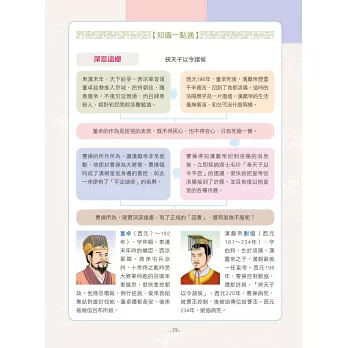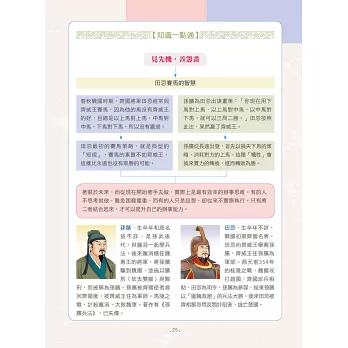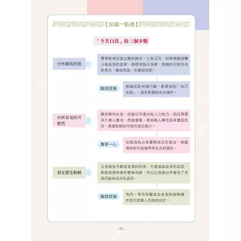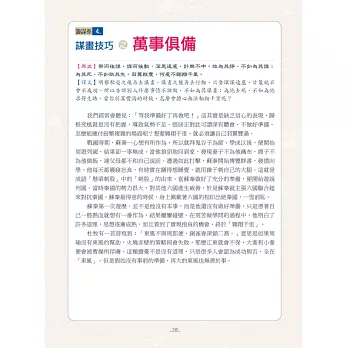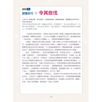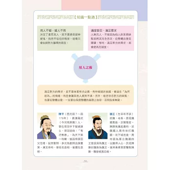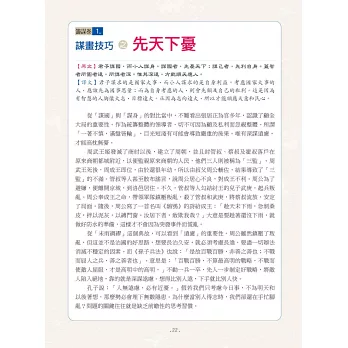 介紹完該篇章主旨後,右頁再將其系統化成表格或樹狀圖,讓你一看就懂得如何運用,並附有兩位歷史人物簡介,在懂得運用權謀之餘,也可以與相關歷史人物作連結。