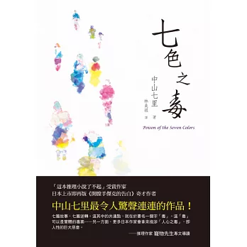 中山七里的新作《七色之毒》裡的七個短篇,說的正是「人心之毒」──仇怨、貪慾、惡意、自以為是、無同理心,這些「毒」隨處都是,並不見得一定致命,卻可能在人們的推波助瀾之下,出現各式各樣的變種,甚至產生驚人的擴散能力,最終釀成殺意或悲劇。-小云──小云的隨便亂記
