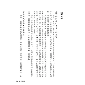 例如,第十八章云:「絕聖棄智,民利百倍。」表面意思像是要絕棄聖智之美名,人民才會得利百倍。事實上,此句是指上位者能啟迪民智,教導人民彼此義利互助,這才是真正的「民利百倍」,同時也是治民之立其本。而當民智開啟,人民已講信互助,這時又何需聖與智者的治理,故可棄絕之矣!