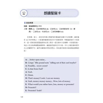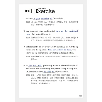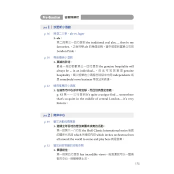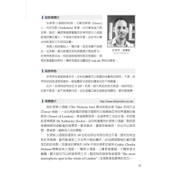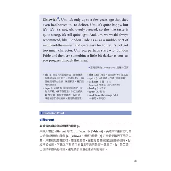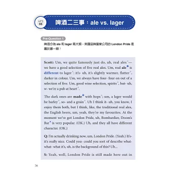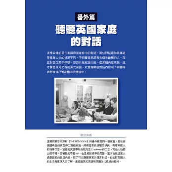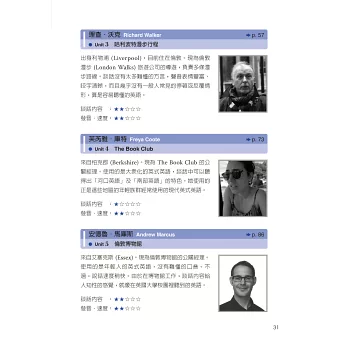 為幫助讀者快速提升聽真實英式英語的能力,本書作者詳細說明了英式英語的發音特色(標準英式英語Received Pronunciation與地方口音的區分),並與美式英語的差異做了清楚的對照,增加讀者對英式、美式發音的了解。最令我佩服的是,作者對書中每一位 受訪者的英語,做了極為詳盡又專業的分析及註解。針對每一段聲音檔,本書也很貼心地為讀者提供了文字及中文翻譯。每一章節的Listening Point作者都會指出特別需要留意的聲音重點,這些都是提升英式英語(包括美式英語)聽力不可缺少的技巧。作者再三強調的「反覆練習、跟著朗讀」等學習 建議,是有效快速增進英語聽力的重要法寶。