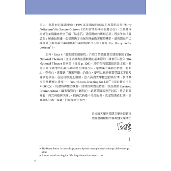 Unit 8「皇家國家戲劇院」介紹了英國重要的國家劇院 (The National Theatre),並提供讀者挑選劇碼的基本原則。可以登入The National Theatre的網站(詳見p.126),其中存有豐富的影音收藏。善用本書作者提供的英式英語聽力練習方法,掌握英式英語的特色,有耐心、有恆心,培養聽「真實英語」的信心,便可充分 觀賞英國名演員及導演的談話。各位可以更上層樓,登入英國大學推出的高水準、製作精良的免費線上課程——FutureLearn - Learning for Life(目前最流行的MOOCs)*,挑選有興趣的課程。授課的英國名教授,說的都是Received Pronunciation,讀者看到的、聽到的,都是英國教授在說話,是名副其實的「英式英語實境秀」。聽英式英語不再是阻礙,而是替讀者打開一扇豐富 的知識、娛樂、終身學習的大門。