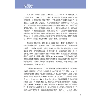 本書《聽,英國人在說話:THE BLUE BOOK英式英語實境秀》與已出版的《聽,英國人在說話:THE RED BOOK英式英語實境秀》,我認為是目前學習英式英語聽力最好的讀本。這兩本書使用的聽力材料,全都是作者在英國現場收錄的「真實英語」 (authentic English),是沒有經過改造、原汁原味的「真人在說話」。讀者或許一開始不習慣聽本書實地錄製的聲音檔。長久以來,我們接觸到的聽力材料,如英語課 本的錄音、檢定測驗的聽力題目,都是由男女錄音員,用單調緩慢的速度,照著寫好的稿子,在安靜無雜音的錄音室內錄製而成的。此種與真實英語脫節的聽力材料,對真正有心要增進英語聽力的人,很難有重大突破。本書多元又真實的聽力內容,彌補了這個缺陷,書中每一段說話者的聲音檔,都值得讀者仔細研讀聆聽。
