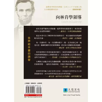 領導特質與魅力或許是與生俱來,但透過有效學習也可以掌握關鍵要領,林肯領導學無疑是最佳的學習典範。──謝文憲,兩岸知名企管講師、商周專欄作家