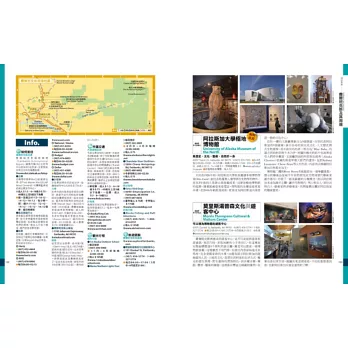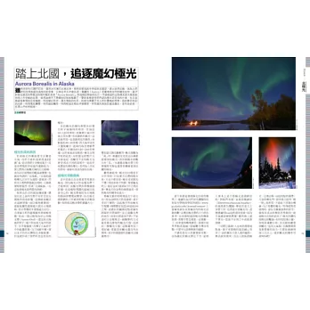 這本《阿拉斯加ACTION》結合內灣航道與阿拉斯加鐵路沿線兩條經典路線,前者是郵輪航行的主要範圍,後者是觀賞極光的必經之路,除了介紹每座城鎮的景點與資訊外,還提供讀者各種不同的玩法選擇與建議。而像是觀賞極光的攻略指南、如何善用各種交通工具、阿拉斯加原住民的故事、可以看到哪些野生動物、有哪些值得參加的活動與必嚐的美食等,本書都有詳細解說,不論你是想要體驗極地風情的背包客,還是嚮往奢華旅行的生活家,都能利用這本書規劃出自己夢寐以求的阿拉斯加行程。