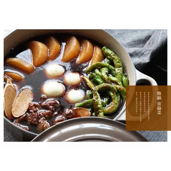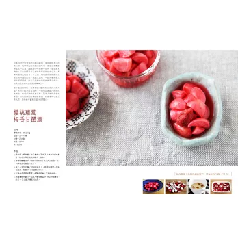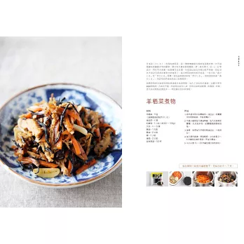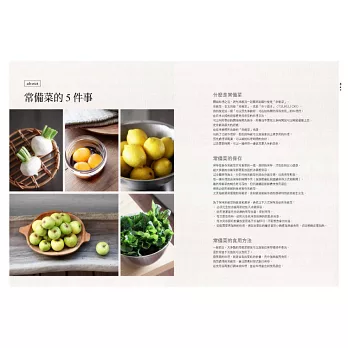 本書以在地容易取得的食材與調味料,變化出日式、台式和融合式等各種不同風味,同時又易於保存的五大類常備菜餚──