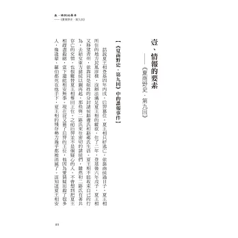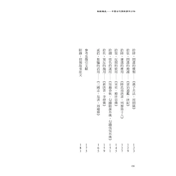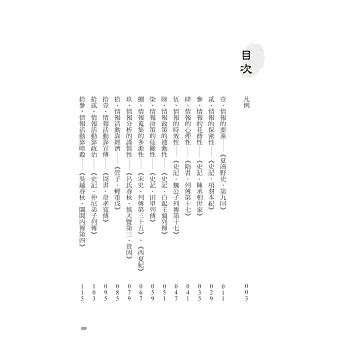 本書共計二十篇,各篇分別有【中國古代情報故事】以及【故事中的情報觀念探討】兩個部分。【中國古代情報故事】將原本見於古典文獻的文言文翻譯為今日生活用語,方便讀者理解故事梗概;【故事中的情報觀念探討】說明該案例的情報學原理,如有相關案例,亦援引作為補充。