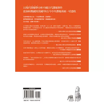 本書以現代筆法詮釋古代史料中的諜報事件,進而接引相關的案例,取材廣泛,穿梭古今。作者用他們熾熱的心、理性的視角,引領讀者探尋知識性、活動性、組織性與機密性的諜報風景,旨明辭切。--逢甲大學中文系助理教授 李綉玲