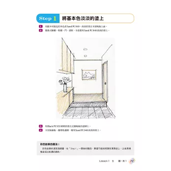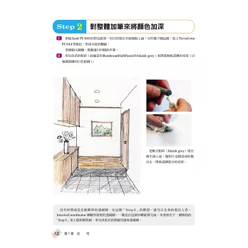 本書採用兩階段方式,若是單純想要傳達理念或是對客戶進行說明,達到「Step2」即可,想適用於會議場合作為報告用途的,可以朝著「Step3」邁進,利用反光及陰影,瞬間提高透視圖的等級,專業感由此呈現。