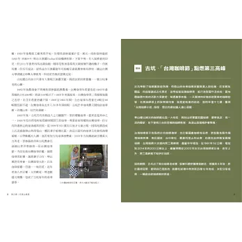 從一八八四年,英國人從馬尼拉帶來第一株咖啡樹,栽種於三峽,台灣咖啡種植已經有一百三十餘年的歷史。中間歷經日據時期、美援時期,以及九二一地震後等三個階段,幾經榮枯,台灣咖啡農的努力,已經讓台灣咖啡在國際上漸漸嶄露頭角⋯⋯