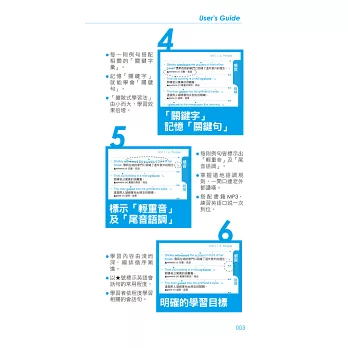 本書特別把英語會話句中的關鍵字詞或慣用語提出說明,讓讀者透過「關鍵字」來記憶「關鍵句」,由小而大的擴散學習法,才能真正將所學習到的內容納入長期記憶中,達到學一次用一輩子的閱讀成效。