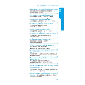 精選15單元及168個情境主題,收錄最完整的英語會話句,宛如一本會話辭典。一書在手,讓你不再有詞窮的時刻出現,隨翻隨找都能找到你想要的那一句。書籍附錄更納入最常見的片語、俚語及縮寫字彙,讓讀者能一手掌握最豐富的英文學習元素。